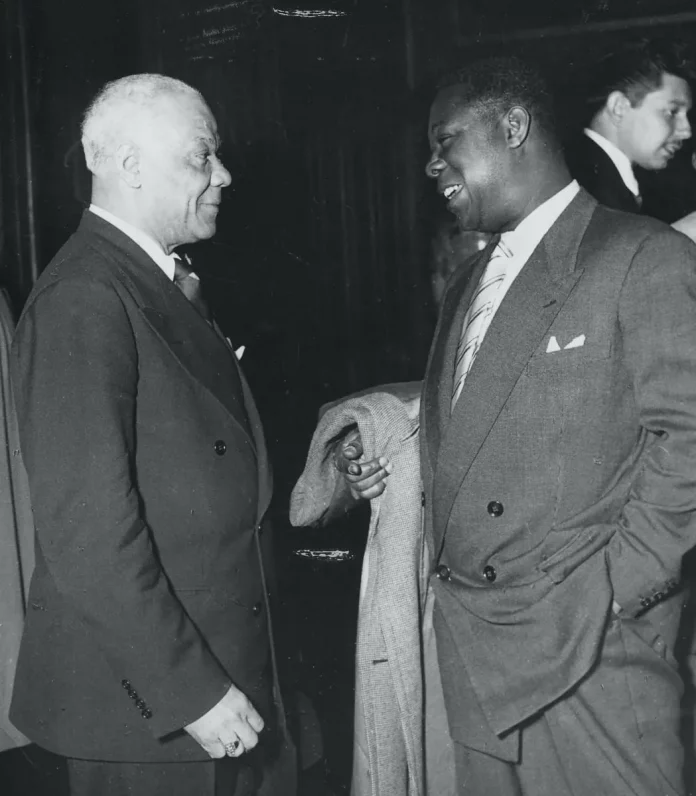 Some of the ones that were outstanding were also controversial. On 27 May 1940, before the United States’s decisive entry into the war, Decca reunited Louis with his off-and-on rival Sidney Bechet to produce four sides – 2.19 Blues, Perdido Street Blues, Down In Honky Tonk Town and Coal Cart Blues. The four titles harked back in style to the last time the two men had played together in 1924. The general thought amongst critics was that because of mutual jealousy the two men felt a coldness towards each other and generally did not get on. Neither Louis nor Sidney ever said anything to confirm this suggestion, and the discord was probably at best invented by fans or at worst was a very minor and irrelevant one.